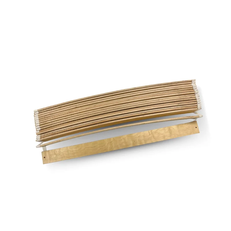 Formspændt lamelbund - 120x200 Cocoon Home FSL-120200 Lamelbunde i formspændt birketræ til 120x200 seng En lamelbund er det bærende fundament under madrassen og spiller en langt større rolle for komfort og støtte, end mange er klar over. Vores lamelbunde er dansk produceret og fremstillet af formspændte lameller i birke-finer, som er designet til at kunne give sig under belastning. I modsætning til flade lamelbunde har de buede lameller en naturlig spændstighed, der arbejder aktivt sammen med madrassen. Den formspændte konstruktion giver madrassen mulighed for at reagere mere dynamisk på kroppens bevægelser og vægtfordeling. Det betyder bedre støtte til skuldre, ryg og hofter samt en mere afbalanceret liggekomfort. Samtidig tilfører lamelbundens fleksibilitet ekstra “bounce” til sengen, hvilket forbedrer det samlede sovemiljø og reducerer følelsen af et hårdt eller dødt underlag. Jo fastere madrassen er, desto vigtigere bliver det, at underlaget kan give sig. En god lamelbund fungerer som et aktivt lag mellem seng og madras og bidrager til, at madrassens egenskaber udnyttes korrekt. Derfor er vores lamelbunde særligt velegnede til faste skum-, latex- og naturmadrasser, hvor fleksibilitet nedefra er afgørende for komforten. Tekniske specifikationer og montering Lamelbundene leveres i fuld bredde op til madrasmål på 100x200 cm. Ved bredere sengestørrelser leveres to separate lamelbunde, hvilket sikrer korrekt støtte og stabilitet over hele sengens bredde. Ved disse størrelser kræves desuden en midterbro i sengerammen, som lamelbunden kan fastgøres til. Montering kræver, at sengen har en indvendig sengesideliste, som lamellerne skrues fast i. Dette giver en stabil konstruktion og gør samtidig sengen nem at montere og afmontere igen. Lamelbundene leveres ikke med skruer som standard, da korrekt skruevalg afhænger af sengerammens materiale og tykkelse. Vi tilbyder dog standardskruer, som passer til de mest almindelige typer sengerammer. Lamelbundene monteres ved at skrue lamellerne fast i sengens indvendige sengesidelister samt eventuel midterbro ved bredere sengestørrelser. Skruehullerne i lamellerne er undersænkede og har en diameter på Ø 5 mm, hvilket sikrer, at skruehovederne ligger plant med overfladen og ikke påvirker madrassens placering. Lamelbundens samlede bredde er bevidst fremstillet et par millimeter smallere end det madrasmål, den er beregnet til. Det sikrer, at lamellernes ender ikke står direkte op mod sengens indvendige sider, hvilket ellers kan medføre friktion, knirkelyde og unødigt slid ved bevægelse i sengen. Da lamellerne er fremstillet i ubehandlet birke-krydsfiner uden overfladebelægning i plastfolie eller plastik-finer, kan der forekomme mindre flosninger i træet og omkring skruehullerne. Dette er en naturlig følge af materialevalget og påvirker hverken funktion, styrke eller holdbarhed. 840,00 DKK Vis produkt